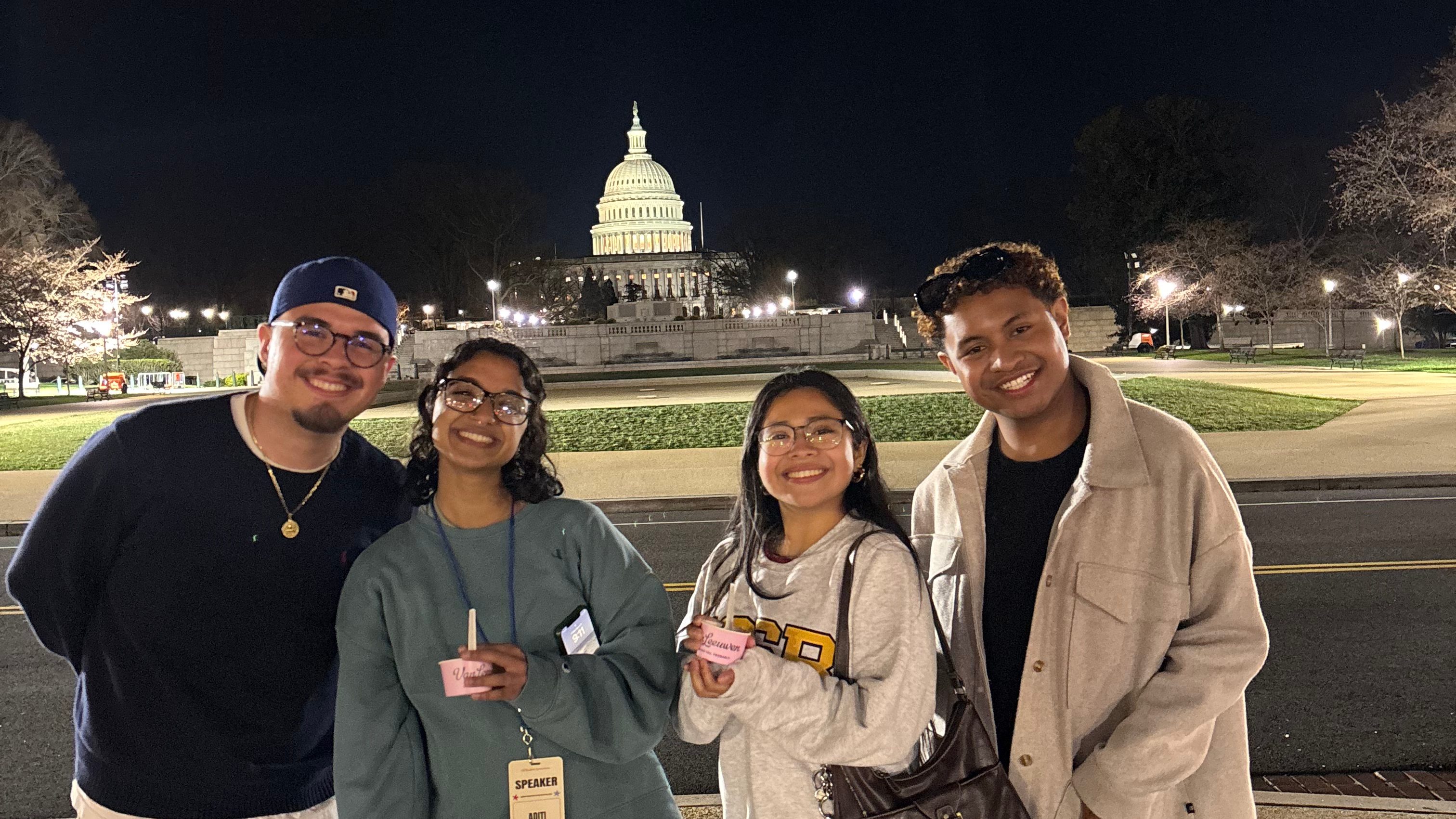 Left to right: Louie (UCSA Communications Director), Aditi (UCSA President), Esther (UCSA Government Relations Chair), and myself with ice cream in front of the capitol. March 2025